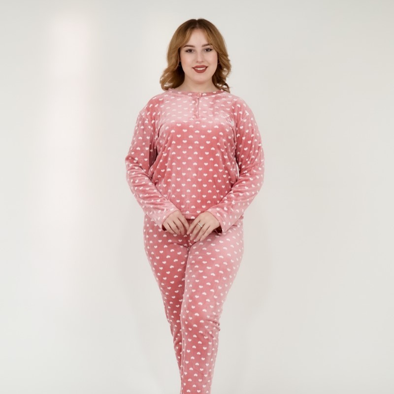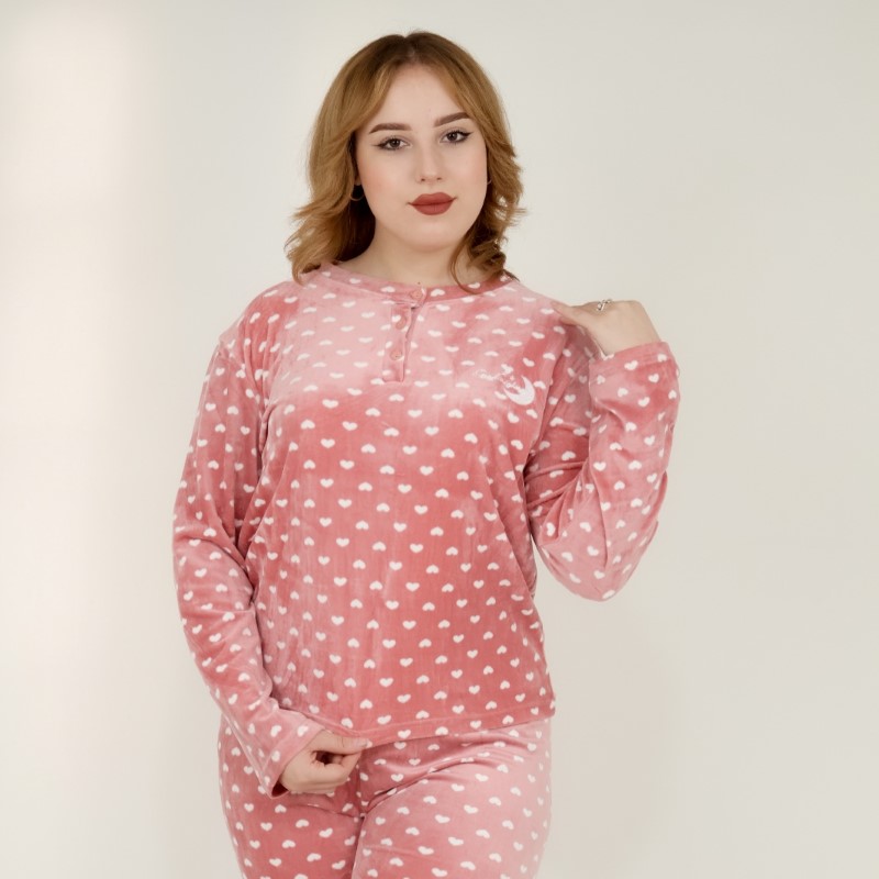 Pyjama en polaire orné de petits coeur blancs avec motif « lune » sur la poitrine et boutons . Doux, chaud et élégant, il offre un confort absolu pour des nuits paisibles et stylées.